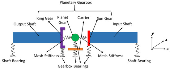 Ferraris et al. [89] studied the vibration characteristics of the double-rotor system with casing using the finite element method and verified the simulation results through experiments. In 2000, Edwards [90] balanced the rotor–support–foundation system and identified the mass, stiffness, and damping parameters of the flexible foundation through experiments. In 2008, Stringer [91] established a six-degrees-of-freedom gear–rotor system model for a helicopter main reducer. At the same time, considering the gyro matrix, the vibration response of the helicopter main reducer was analyzed. From 2008 to 2010, Inalpolat et al. [92,93] analyzed the influence of time-varying mesh stiffness, gear manufacturing error, and input speed on the dynamic response amplitude of multi-stage planetary gear systems of the automatic gearbox. In 2016, Zhang et al. [94] established the corresponding dynamic models of the two-stage planetary gear transmission system by using both the lumped-mass method and the finite element method to compare and analyze their dynamic characteristics. In 2016, Srikanth et al. [95] carried out a dynamic analysis of the wind turbine transmission system under random aerodynamic loads. In 2020, Xiao et al. [96] established the dynamic model of the planetary gear transmission system by using the lumped-parameter method, and the dynamic responses of normal and fault systems were obtained. In 2021, Min et al. [97] established the non-linear dynamic model of planetary spur gear transmission systems using the mass concentration method. The influence of tooth clearance on the gear vibration response is obtained via the phase plane diagram and the FFT spectrum diagram. In 2020, Tatar et al. [98] used a three-dimensional dynamic model to study the influence of the parameters on the dynamic response of planetary gear rotor systems, including the number of planetary gears, planetary gear mass, gear meshing stiffness, planetary gear speed, etc. Figure 13 shows a schematic diagram of the planetary gear–rotor system.