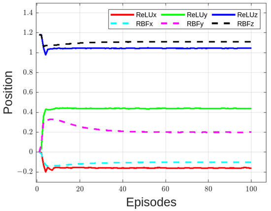 The performance of tip position using RBF and ReLU is shown in Figure 7. From the figure, position in x-axis and z-axis are slightly different but position in y-axis is significantly different and does not improve over time. This implies that the tip did not arrive at the target position. In the figure, 1 point represents 50 episodes. This was plotted to improve visualization quality of the plotted data. During testing, the ReLU trained model was found to have the best performance and, hence, it is maintained as the activation function in the rest of the paper. The simplified activation function is shown in (8). In this case, the Adam optimizer is applied for stochastic gradient descent during training [34].