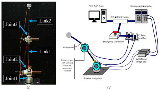 Setup of the flexible manipulator. (a) Actual flexible manipulator, (b) illustration of the manipulator setup.