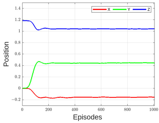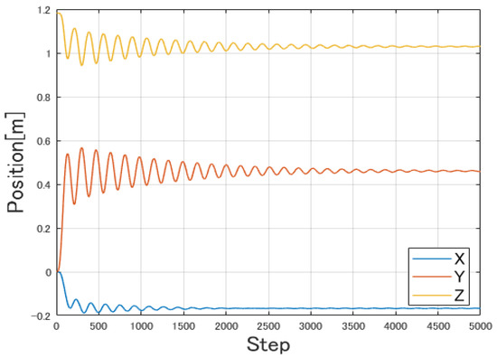 Figure 14 shows the trajectory of the end effector after the learning phase. In this case, one episode is 500 steps. Compared with Figure 12, it can be seen that vibration has been suppressed. However, although the end effector is moved to the target position, it is clear from Figure 15 that strain has not been suppressed.