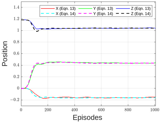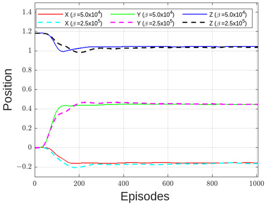 Figure 18, Figure 19 and Figure 20 show the results of the trajectories and strains for various values. From the results, the end effector reached the target coordinates in all reward functions. Notably, for higher values, slightly more time was needed before the position settled. This is as seen in Figure 17 where position of end effector in z-axis settles at around 300th episode for , compared with , which settles at approximately 150th episode.