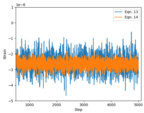 Regarding the strain, different values of resulted in different strain suppressions, as shown in Figure 18 and Figure 19. When was made larger than the strain distortion diverged, as shown in Figure 20. This is considered to be the effects of distortions caused on the overall reward being too large. From the figure, Equation (15) with set to was considered the optimal reward function.