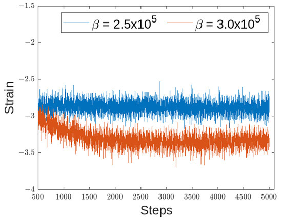 Strain of Link 1 for β of 2.5 × 105 and 3 × 105.