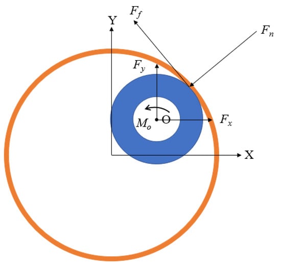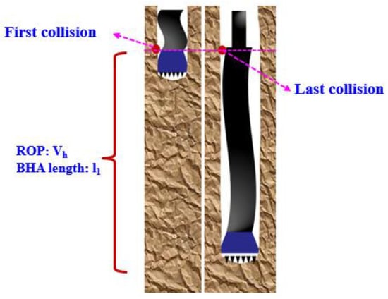According to the contact area calculation formula, the contact area between the drill pipe and the drill collar and the wellbore is calculated, and the minimum force required to destroy the rock is calculated according to Equation (7). By combining the derivation of the first section, it can be seen that by obtaining the radial displacement and velocity of the center of mass at any moment on the cross-section of the drilling column, the collision force between the drilling column and the wellbore at that moment can be solved , which can be further combined with the collision frequency to derive the coefficient of the wellbore destabilization, so the establishment of a nonlinear dynamic model of the drilling column and its solution is especially critical.