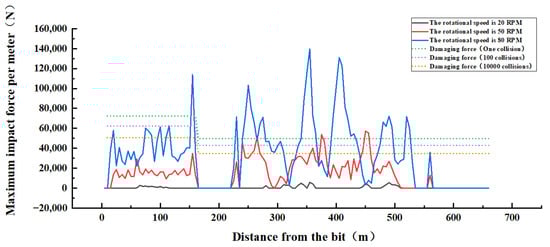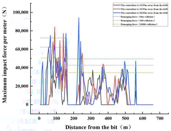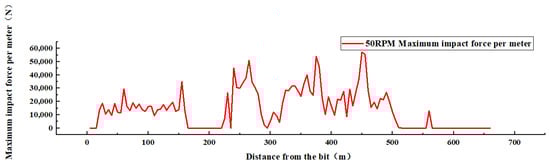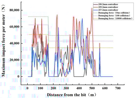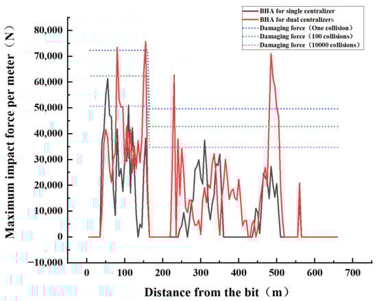 From the perspective of the collision force of single and double centralizers (see Figure 25), regarding the collision force of the combination of double-centralizer drilling tools, four places exceed the force required for one failure, and at 155 m from the drill bit, the maximum collision force is 75,730.5 N. The collision force of the whole well of the single-centralizer drilling tool combination did not exceed the force required for one failure, and the maximum collision force was 62,139 N at 60 m from the drill bit, which was reduced by 18% compared to the double-centralizer drilling tool.