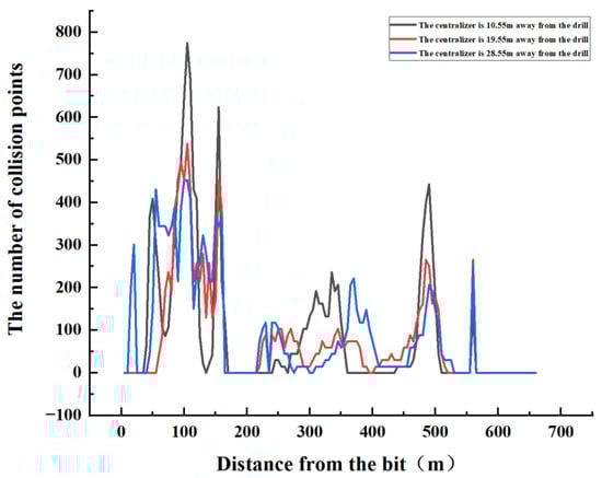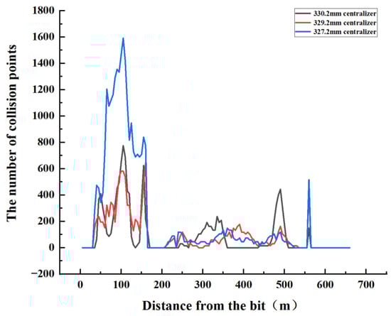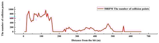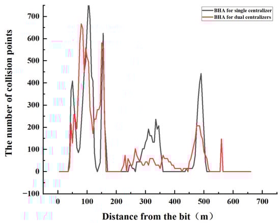 The combinations of single- and double-centralizer drilling tools were simulated with a drilling pressure of 16 t and speed of 50 rpm, and the collision frequency of the two was compared (see Figure 24). The collision frequency of the double-centralizer drilling tool combination reached a peak of 667 times at 80 m from the drill bit, indicating that the bottom movement of the well is complex, the collision frequency of the drill pipe part is relatively stable, and the curve fluctuation is not large. In the combination of single-centralizer drilling tools, the collision frequency at BHA was higher, reaching a peak of 775 collision frequencies at 105 m from the bottom of the well, and the collision frequency of the double-centralizer drilling tool combination was reduced by 14% compared with the single centralizer.
