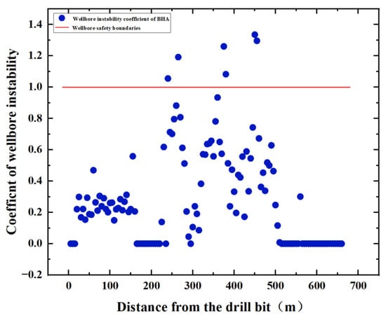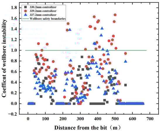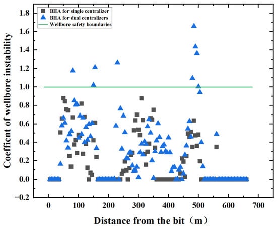 In the comparison and analysis of the wellbore instability coefficient of the combination of single- and double-centralizer drilling tools (see Figure 26), it is found that nine positions of double-centralizer drilling tools exceed the wellbore instability coefficient of 1, but the combination of single-centralizer drilling tools does not exceed the wellbore instability coefficient of 1 in the whole well. It can be seen that the stability of the wellbore of the single-centralizer drilling tool combination is significantly higher than that of the double-centralizer drilling tool combination.