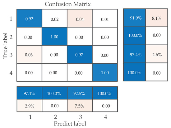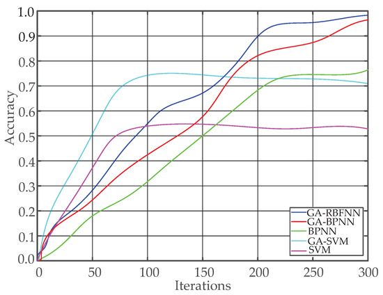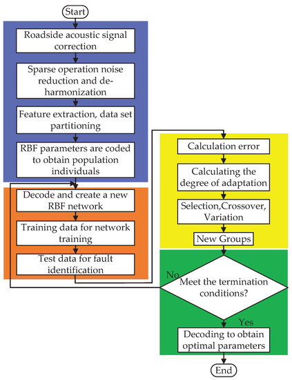 - For the premise of low-efficiency fault identification in roadside acoustic signals and less-researched methods, a GA-RBFNN model of roadside acoustic fault feature diagnosis was proposed. Using the characteristics of GA’s adaptability to large data processing and robustness, and RBNN’s simple structure and fast processing speed, the simulation experiments of TADS fault acoustic data in a railroad section site prove that, after a variety of time–frequency domain fusion clustering acoustic feature vector inputs, the model can achieve fast and accurate identification of the fault type, with a recognition accuracy as high as 97.22%. The superiority of the method is comprehensively demonstrated when comparing the diagnosis rate and accuracy with those of other diagnosis models.
