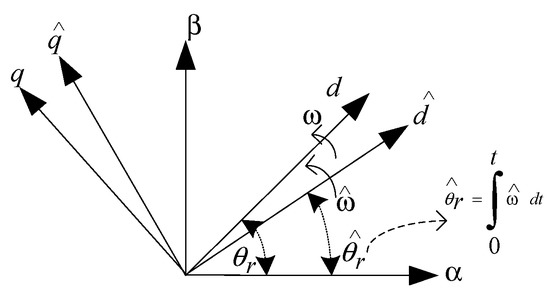 Figure 1 depicts the space vector representation of an IPMSM. The frame represents the SRF, while the frame represents the synchronous coordinate system. The frame is utilized in vector control without sensors with a rotor reference frame. Moreover, and represent the real and estimated position of the rotor, respectively.