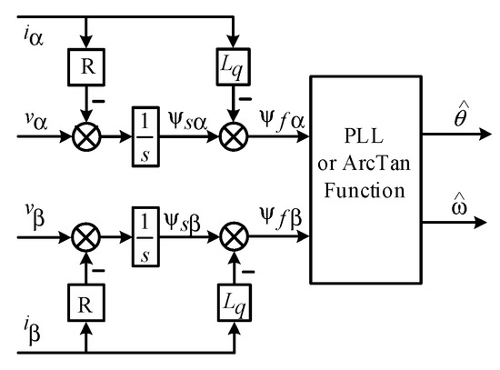 where and are the axis and axis equivalent rotor flux linkage. In [12], stator voltage and current integration are used to obtain stator flux linkage and as well as rotor flux linkage and . The system then utilizes a conventional PLL or ArcTan function to estimate the rotor position (RP) and speed , as depicted in Figure 2.