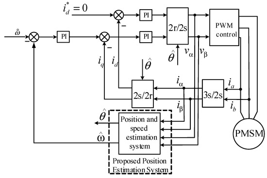 In motion-sensorless feedback-loop control approaches, rotor position knowledge is crucial. Feedback-loop motion-sensorless control mechanisms are additionally categorized into two subcategories based on the distinct assessment principles for rotor-position information: injection of a high-frequency carrier signal method (IHFCSM) [6,7,8] as well as model-based techniques [9,10,11,12,13,14,15,16,17]. The IHFCSM offers a promising solution by utilizing magnetic saliency identification and introducing a signal with an HF to interact with rotor-orientation-dependent saliencies. Such approaches can perform well at zero to low speeds and are irrespective of the back electromotive force (EMF) and machine parameters. Still, as the machine speed increases, they encounter issues such as additional losses, ripples in the torque, high-frequency noise, and power losses, which can only be applied to saliency motors and constrained control performance brought on by the additional filter [8]. Model-based solutions, comprising flux linkage estimation methods [13,14,15,16,17] and back-EMF estimation strategies [9,10,11,12], are passive techniques that do not rely on signal injection. In the preceding, numerous EMF observers have been established and utilized in industrial and commercial environments. These techniques have demonstrated satisfactory performance in regions of moderate and high speed. However, as the motor RPM goes down, the rotor orientation may be imprecisely acquired since the EMF gradually decreases, and disappearance is insufficient to provide accurate knowledge about the rotor orientation at minimal or zero velocities. To accomplish sensorless position control of the PMSM throughout the entire speed domain, hybrid position estimation solutions [9,10,11] that combine the aforementioned two approaches are commonly employed. The SFL estimation technique is anticipated to facilitate broader speed domain sensorless operations compared to the EMF estimation strategy because of the proven fact that the rotor flux linkage remains unchanged and is practically constant regardless of speed; however, since sensors always have a Doff, a pure integrator has drift issues.