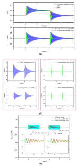 Additionally, the proposed drift elimination schemes can successfully eliminate drift from the flux and do not induce any steady-state error. The drift elimination response under the drift elimination scheme 1 (DM1) control is slower compared to the drift elimination scheme 2 (DM2) control. The drift elimination under DM2 is smoother and more stable, resulting in a faster response. Figure 7 demonstrates that DM2 exhibits higher accuracy in estimating the drift amplitude and removing drift more rapidly (i.e., it has a smaller setting time) than DM1. DM2 significantly enhances the dynamic performance and estimation accuracy of sensorless control.
