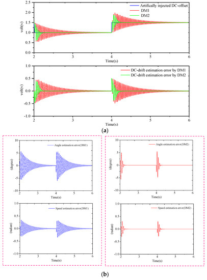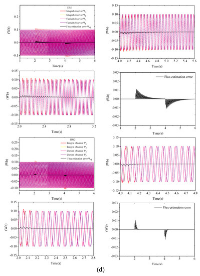 The observed speed and position estimation error, a Doff error component, varying between 0 V and 0.6 V, is artificially injected into the stator voltage -axis at the no-load condition. The observed speed, estimated RP and speed errors, artificially injected Doff and DC-drift estimation error, estimated fluxes, and the errors of estimated fluxes based on the DM1 and the DM2 with PLL are shown in Figure 7a–d, respectively. Although both estimators perform well, the DM2-based estimators perform better than the DM1-based one.