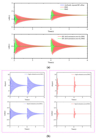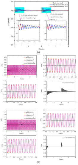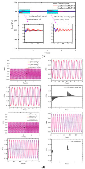 Matlab Simulation results with constant speed (300 r/min) under the -axis voltage disturbance (0 V and 0.6 V). (a) Artificially injected Doff and DC-drift estimation error, DM1, and DM2. (b) Speed and position estimation error, DM1, and DM2. (c) Observed speed estimation, DM1, and DM2. (d) Estimation fluxes and the errors of estimated fluxes, DM1, and DM2.