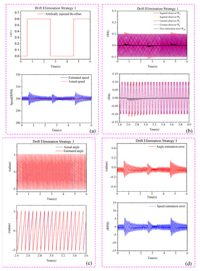 Experimental results of drift elimination strategy 1 with 300 RPM speed under the -axis voltage disturbance. (a) Artificially injected Doff and speed estimation; (b) flux estimation and its enlarged view; (c) angle estimation and its enlarger view; (d) angle and speed estimation errors.