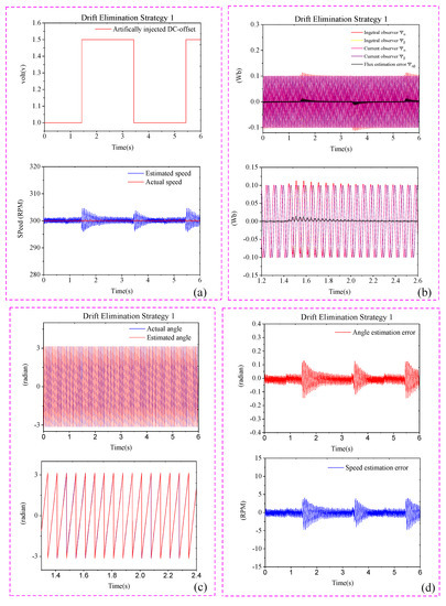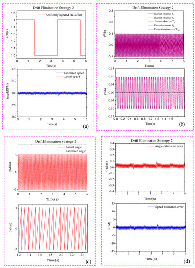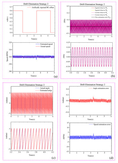 Figure 9 depicts the dynamic features of the two proposed algorithms with a constant speed of 300 r/min under -axis voltage disturbance. First, when a 1 V DC drift error is artificially applied to stator voltage at 2 s, a severe pulsation is maintained in the estimated flux, speed, and RP angle. Both proposed drift elimination schemes effectively address the real-time DC offset error component. Figure 9 demonstrates that the estimated fluxes closely match the actual ones. The PLL-based drift elimination strategy 2 successfully overcomes the speed, flux, and rotor position angle transient at 0.5 s, with the estimated flux waveforms accurately tracking the actual fluxes of the motor. Secondly, at 4 s, the Dec is increased by 1.5 V. The compensation eliminates the speed and position estimation pulsations despite the additional disturbance, ensuring a stable value. Even though the magnitude of the Dec varies under -axis, it can be demonstrated that the real-time compensating characteristic is exhibited well. The response for drift elimination under DM1 control is slower.