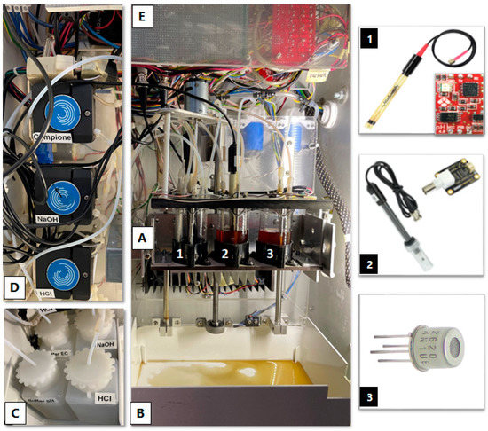 Internal part of the main case consisting of: (A) 3 beakers fixed on a motorized basket with Peltier cells, inside of which house the sensors, namely pH-meter (1), conductivity meter (2) and gas sensor (3); (B) collection tray for emptying the beakers; (C) 4 bottles containing the reagents and holding buffers for the pH-meter and conductivity meter probes; (D) 3 stepper pumps that feed the beakers by drawing brine and reagents in stoichiometric amounts; (E) 3 Arduino microcontrollers that interface the hardware with the control system.