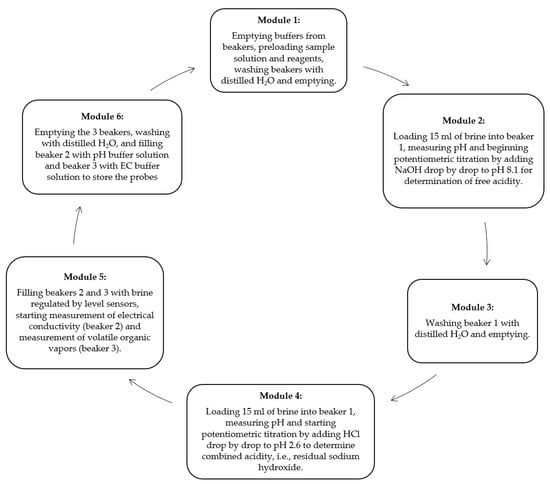 The analysis procedure is a robotic reproduction of the operations that would be performed by a human operator on the brines, namely: determination of free acidity and combined acidity in beaker 1, determination of salt concentration in beaker 2, and determination of volatile acidity in beaker 3. The software supervises activities of the analysis hardware module to which it is connected, then provides for sending commands to the three connected Arduino modules and recording all the activities performed; it also provides for the survey of electrical conductivity values, volatile acidity, and the inherent calculation of lactic acid and residual sodium hydroxide by measuring pH values.