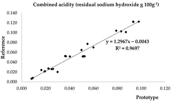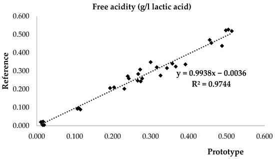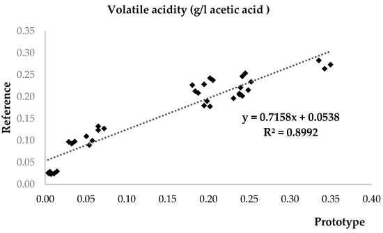 For volatile acidity expressed as acetic acid concentration (Figure 8), comparing the experimental method of the prototype and the reference method, the coefficient of determination of the linear regression curve is lower than that of the other analytes (0.899), with a mean deviation between the two methods of about 0.01 g/L.
