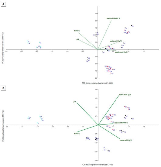 The bi-plot PCA reported in Figure 9A,B shows the scores of the 12 brines in relation to the different parameters included in the analysis, where each loading vector represents one of the parameters under consideration and the closeness of the vectors is indicative of the correlation among the parameters. The first component (which accounted for 61.35% of the total variance) was strongly associated with acetic acid and lactic acid concentrations, while the second component (which accounted for 17.64%) was mainly associated with residual NaOH, and finally the third component (which accounted for 11.91%) was associated with pH and acetic acid concentrations.