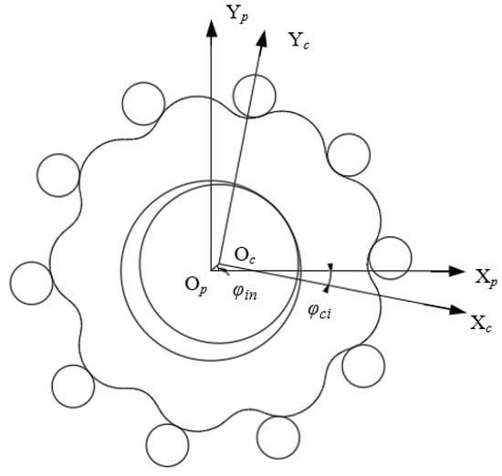 In the process of solving, since the transmission error of the cycloid-pin gear has a period, the size is 2π/zp [12]. The cycloid drive error has a period of size 2π/zp [14]. The equation of the cycloid gear expresses only one tooth. In this paper, the x-coordinate of the pinto equation is translated by a distance along the negative direction of the x-axis in order to facilitate calculations. The distance size is eccentric distance a. This makes it easier to determine the meshing range of the cycloid gear with the pin tooth. If so, the displacement transformation of the coordinate transformation matrix Mcp in the direction of the x-axis also requires translation by a displacement of one eccentric distance a in the negative direction of the x-axis.