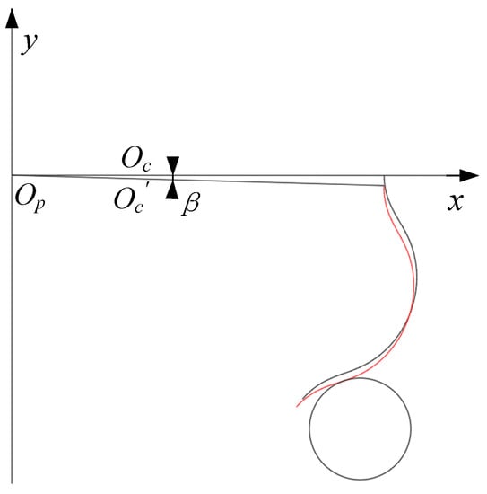 When calculating the transmission error, the moment when the cycloid gear enters into engagement needs to be considered. There is no clearance between the standard cycloid gear and the pin tooth mesh. The crankshaft needs to be turned through a certain angle to overcome the clearance and engage the cycloid with the pin tooth. Make an assumption based on TCA. If the crankshaft drives the modified cycloid under no load, when the cycloid is not yet in contact with the pin tooth, the crankshaft and the cycloid turn through the same angle, so that β is the angle of rotation of the cycloid from its initial position to enter engagement, as shown in Figure 3, and the red curve is the profile of the cycloid tooth that overcomes the clearance to just engage the pin tooth. When the cycloid gear is just engaged with the pin tooth, Equation (15) has a solution and φin = φci = β.