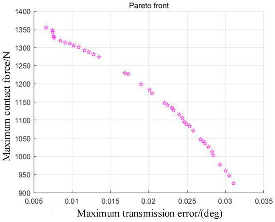 The Pareto optimal solution should be a point diagram with an overall uniform distribution in general. The graph shows that the contact force and transmission error are mutually constrained: as one becomes smaller, the other must become larger. The uniform distribution of the scattered points indicates that the multi-objective optimization results are reliable.