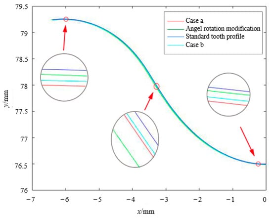 For the purpose of leaving a reasonable clearance and maintaining the conjugate tooth profile, the compound modification coefficients are ∆rp and ∆rrp. The compound modification tooth profile should fit the profile of the rotation angle modification as closely as possible. The rotation angle modification coefficient ∆φ of 0.0005 rad was chosen as the target for the compound modification method to fit.