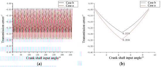 Excluding the effect of errors, solving Equation (15) for the modified cycloid gear profiles and then bringing the result into Equation (16) can find one period of transmission error for a single tooth, and by translating the angle of one period 2π/zc [27], the transmission error curve for one period under no load can be obtained. The change in transmission error as the crankshaft turns through one revolution is usually taken as a small period of the cycloid-pin drive. As shown in Figure 8, Figure 8a can be obtained by translating Figure 8b.