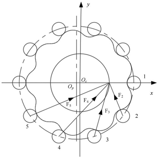 The contact forces between the cycloid gear and the pin teeth affect the performance of the cycloid-pin drive in terms of load-carrying capacity, service time, etc. The multi-objective optimization modification in this paper needs to consider the maximum contact force during the cycloid-pin drive. The contact forces between the cycloid gear and the pin teeth are shown in Figure 9, and the figure shows the standard cycloid gear.