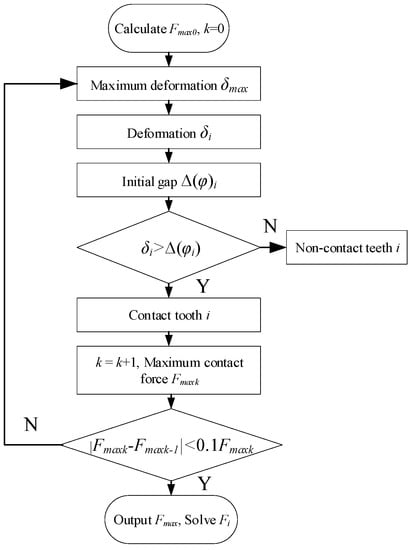 Equation (21) shows that it is necessary to know δmax and the mesh tooth number to solve Fmax, and according to Equations (25)–(27), it is necessary to know Fmax to solve δmax. δmax and Fmax are mutually known variables, so it is necessary to give the initial value of Fmax firstly. The initial value Fmax0 is: