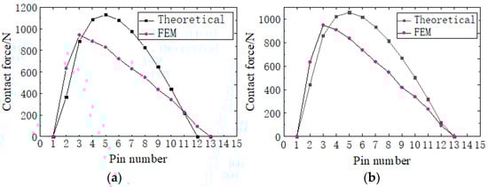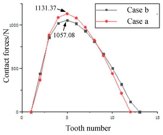 The contact forces obtained from the static analysis are extracted, and a comparison of the contact forces obtained by the two methods is shown in Figure 15. Figure 15a,b show the comparison of the theoretical contact forces and the finite element method contact forces for the two modification methods, respectively. This reflects the number of tooth pairs that were meshed after loading the tooth profile obtained by modification. Case a simultaneously engages 10 pairs of teeth from tooth numbers 2 to 11. Case b engages 11 pairs of teeth from 2 to 12. The higher contact forces for both methods are concentrated on teeth 4, 5 and 6, with the maximum contact forces for Case b being somewhat lower. The overall trend of the results is similar to the theoretical calculation results, so the correctness of the theoretical calculation results can be verified.