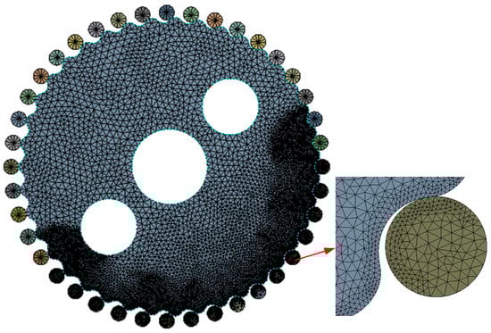 The contact forces of the cycloid drive can be verified with a static finite element model. The model mesh is shown in Figure 13. Only one piece of the cycloid gear is retained in the static analysis model, and the width of the cycloid gear is the same as the length of the pin teeth. In this paper, we mainly analyze the contact area of the cycloid gear. While the cycloid drive process is a dynamic process, for all pin teeth, as soon as they enter the engagement interval, they become the first contact teeth [33]. For this process, only one particular position in the drive needs to be analyzed to view the contact forces during the drive. The analysis in this paper is of the position where the cycloid gear overcomes the gap and just makes contact with the pin tooth under the action of the torque. The material of both the cycloid gear and the pin tooth is set to bearing steel, with a material modulus of elasticity E = 2.06 × 1011 MPa, Poisson’s ratio of 0.3 and a density of 7850 kg/m3. According to the principle of motion of the cycloid-pin gear drive, the motion process can be approximated as a moment in which the cycloid gear rotates freely along the circumference of the eccentric axis, the pin tooth is fixed, and the cycloid gear rotates in contact with the pin tooth and transmits the motion [33]. The transmission load acts on the cycloid gear, and the model applies a transmission torque T = 420 Nm.