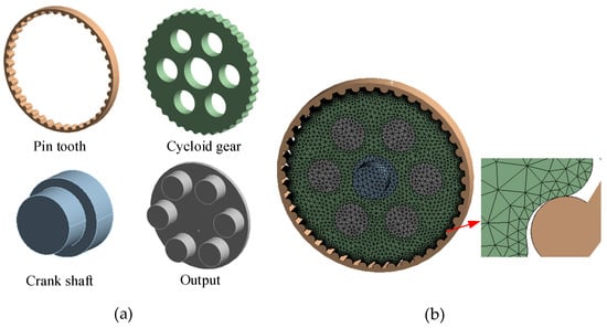 Dynamic analysis model for cycloid-pin gear: (a) Parts of dynamic finite element analysis; (b) Assembly model and mesh generation.