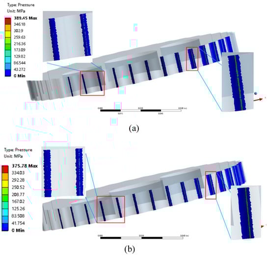 Contact stresses for modified cycloid gears: (a) Compound modification; (b) Multi-objective optimization modification.