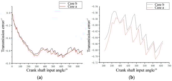 Deriving the angular displacement variations of the cycloid and crank shaft during the FEM dynamic analysis and calculating the transmission error according to Equation (16), the loading transmission error can be obtained as shown in Figure 17. Figure 17a is the transmission error by FEA.