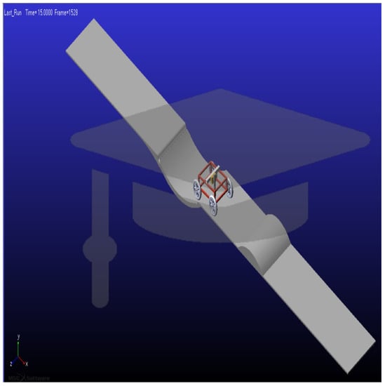 Figure 9. The SolidWorks design (3D model) of the mobile manipulator, including the terrain profile with varying ground elevations, was imported into ADAMS software. Contact forces between the ground and wheels were defined, along with a linear force acting on the center of mass of the robot.