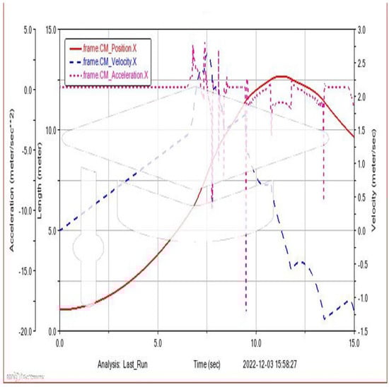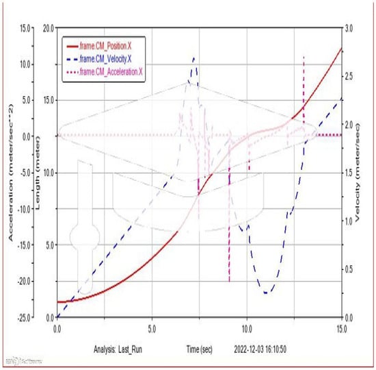 Figure 10 illustrates the performance of the model under a linear force of 200 N. It can be observed that the model faced difficulty negotiating the high ground, resulting in a deceleration after approximately 12 s. The center of mass of the frame exhibited a continuous increase until 12 s, after which it started moving in the reverse direction.