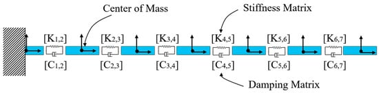 The approach adopted for the simulation of bristle compliance is the discrete flexible multibody model (DFM). Considering this approach, each bristle is discretized into several rigid bodies connected in series through stiffness and damping matrices (Figure 1). Both inertial properties, stiffness, and damping matrix coefficients depend on the beam’s dimensions and material. Adjacent bodies interact due to stiffness matrices, which produce reaction forces and moment fields depending on the relative displacement between nodes’ coordinate reference systems. Each stiffness matrix can then be represented according to the Timoshenko beam theory [] as follows: