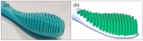 With the aim of verifying the methodology, a case study in which the toothbrush is constrained to slip on a flat surface is performed. The main scope of these boundary conditions is to check the numerical model’s behavior in a systematic and reproducible scenario. The brush is initially positioned in contact with the flat surface. A motion of 3 mm along the bristles axis is applied so that the inflection of the bristles occurs. Subsequently, a circular motion is imposed on the toothbrush. A measure of the normal and tangential forces is provided to compare the numerical model with the experimental. The tridimensional model is created by adopting reverse engineering techniques. In particular, the process was performed using a Microscribe GX2 by Revware, a 3D coordinate measuring machine (CMM) for implementing a point-data measurement of the brush’s base. Data points were taken at high density to reflect the complex shape of the object. The data points were then imported into a CAD environment to build curves and surfaces, thus recreating the main body. On the other hand, the use of a caliber allowed for the reverse engineering of the bristle locations and dimensions. The defined CAD geometry of the toothbrush is reported in Figure 2b and compared with the real silicon sample in Figure 2a.