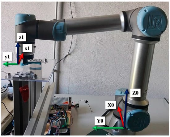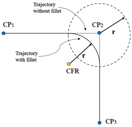 Experimental results are determined with the UR5 algorithm explained below. Considering the system of references adopted in Figure 4,the circle path is obtained with the MoveL command, which moves the TCP center of the coordinate system linearly between two control points []. As shown in Figure 5, two MoveL commands are imposed in sequence: the first one from CP1 to CP2, and the second one from CP2 to CP3. In the first command, a fillet radius is set equal to r, so the TCP trajectory follows the continuous line. As a result, the TCP transits around the CP2, allowing the arm to not stop at that point. If the fillet radius is not set, the TCP trajectory follows the pointed line.
