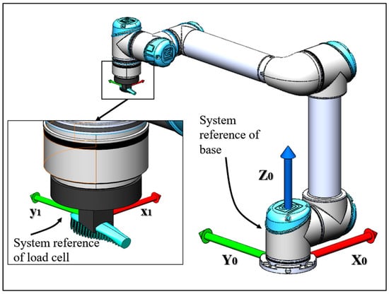 As previously disclosed, the tip of the Robot is programmed to follow a circular motion with a radius of 20 mm. The circular path analysis is also created with the multibody model previously described. The model has six motion constraints that bind the toothbrush base to follow the same circular trajectory as the experimental. Moreover, the trajectory that the Robot follows was checked in the postprocessing of the experimental results to be the same as the one imposed and shown in Figure 6, with the reference frame of the robot tool center point (TCP) highlighted.