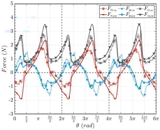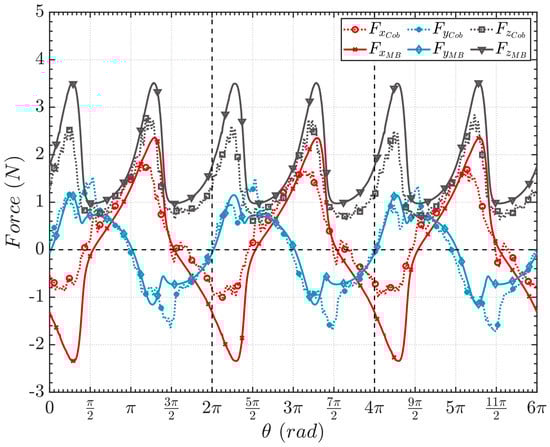 The forces that the load cells measured in the experimental analysis during three circular rotations are shown in Figure 7 as solid lines. Furthermore, the reaction forces calculated with the multibody model in the motion constraints are aligned accordingly to the robot reference frame and are presented in the same figure as dotted lines.