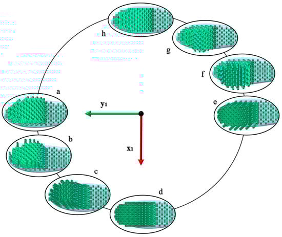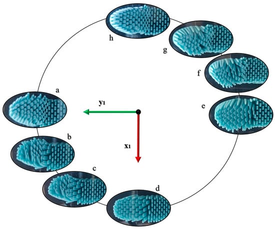 Without any loss of generality, the upper-right quarter is considered to describe the inversion phenomenon. The bristles in Figure 8e are deformed in parallel planes along the same direction. With the incoming change of the motion direction from the x-axis to the y-axis, the bristles indent and start inverting the direction of their deformed shapes (Figure 8f). During the inversion, the forces peak at the highest values and then decrease when the bristles return to being almost on parallel planes and in the opposite direction to the one imposed by the motion (Figure 8g,h). Mirror behavior occurs for Figure 8a–d.