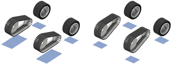 To combine the benefits of wheels and tracks and adjust the contact area based on the soil conditions, we proposed a locomotion system to change the contact patch [18], and we realized “Hadrian” a new wheel/track reconfigurable vehicle. The vehicle is equipped with a locomotion system that can switch between a wheeled and a half-tracked mode by partially lifting the tracks’ idlers and leaving only the sprockets in contact with the soil to have a wheel shape interacting with the ground. This concept is depicted in Figure 1.