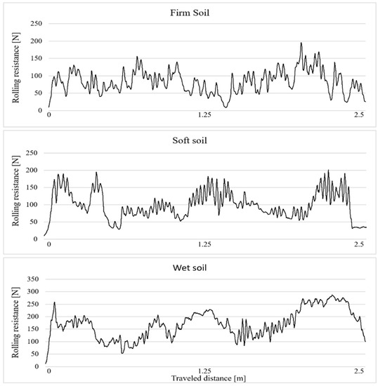 We tested the rolling resistance and sinkage of our designed track module in a soil bin facility built at the Kyushu Institute of Technology [18]. We have mixed clay, silt, and sand in the percentages of 20%, 40%, and 40%, respectively, to obtain loam soil [24] with the frictional and cohesive properties typical of agricultural soil. Then, we carried out several pull-tests in which the track was mounted to a frame, loaded to 100 kg, and pulled for 2.5 m at a constant velocity by a walking tractor through a steel wire. The steel wire was attached to a force gauge sensor to measure the rolling resistance. We tested on different soil conditions: firm, soft, and wet saturated. In Figure 3, some of the test results are shown. As expected, the highest rolling resistance is obtained for the case of deformable soil (soft and wet), although the mechanism of soil deformation in the two cases is different. In soft conditions, the soil contains a higher fraction of pore space, which undergoes a compaction and volume reduction during the track pass. In saturated wet conditions, the pores are filled with water, making the soil incompressible and leading to deformation by distortion. We have a significant volume of deformed soil and a corresponding high rolling resistance in both cases.
