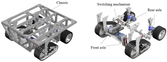 To describe Hadrian’s mechanical solution, we can divide the vehicle into three main groups, all mounted to the chassis: rear axle, front axle, and switching mechanism. Figure 4 shows the full vehicle and the three main groups.