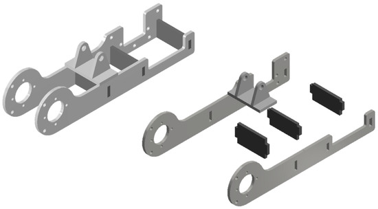 Unlike the rear axle, the traction motors of the front axle are positioned within the chassis. The traction motor drives the sprocket gear through a chain coupled with two sprocket gears, and the transmission ratio is 1. Each sprocket gear is rigidly connected to the chassis by a pair of links. The idlers are connected to the switching mechanism by a shock absorber. Two thrust bearings mounted in O-configuration support one end of the driven shaft. Figure 8 shows the design solution adopted for the front axle. The triangular elements connected to the tracks increase the system’s overall stiffness during the turning maneuvers, when the tracks experience lateral forces. In Figure 9, the assembled wheel group and track group are shown.