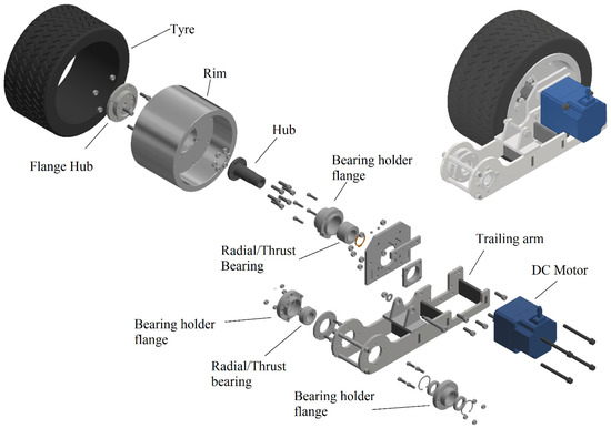 The rear axle consists of two wheels connected to the chassis through a longitudinal trailing arm suspension system. This type of suspension system has the advantage of being simple and compact. The trailing arm consists of welded steel parts, as described in Figure 5. Each wheel has a traction motor directly connected to the wheel hub. This configuration saves space onboard, leaving room for the batteries and the electrical system components at the vehicle’s rear inside the chassis. In Figure 6, the wheel system is shown in detail.