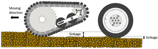 The different contact area also impacts tracked and wheeled vehicles’ traction performance and energy consumption. If the soil has cohesive properties (i.e., contains clay), a larger contact patch ensures a higher traction force [17], while on frictional soils, a higher normal stress can increase the soil strength and might lead to a higher draught. Moreover, the volume of soil deformed is the main contribution to the running gear rolling resistance. If the contact area is small, we can expect a high sinkage and rolling resistance on highly deformable soil. Conversely, a large area would reduce the sinkage.